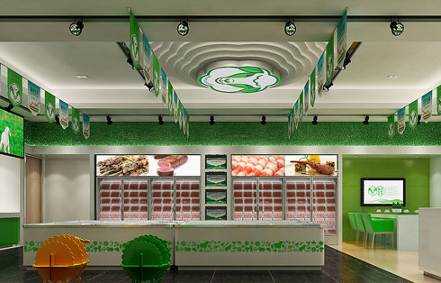 上海公裝公司案例:本案生鮮超市后現(xiàn)代工業(yè)風(fēng),賣場個性化設(shè)計,點(diǎn)睛綠可讓整個空間鮮活起來。